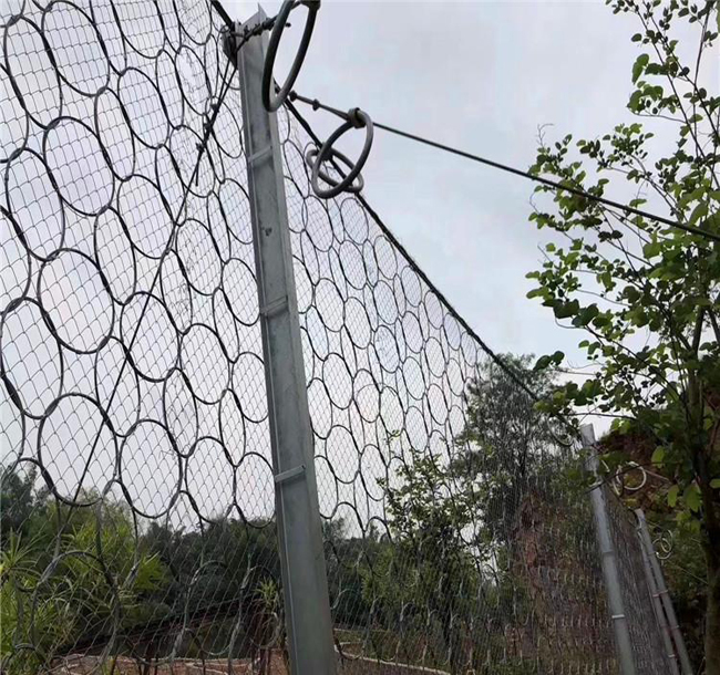 材質:鋼絲繩網、支撐繩和減壓環構造:由鋼絲繩網或環形網(需攔截小塊落石時附加一層鐵絲格柵)、固定系統(錨桿、攔錨繩、基座和支撐繩)、減壓環和鋼柱四個主要部分構成。