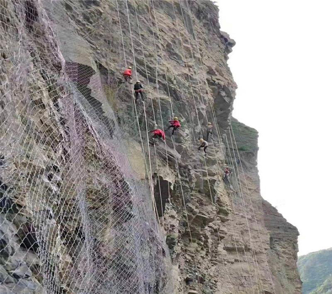 邊坡防護網(wǎng)有主動防護與被動防護,主動防護系統(tǒng)是以鋼絲繩網(wǎng)為主的各類柔性網(wǎng)覆蓋包裹在所需防護斜坡或巖石上,以限制坡面巖石土體的風(fēng)化剝落或破壞以及為巖崩塌(加固作用),或?qū)⒙涫刂朴谝欢ǚ秶鷥?nèi)運動(圍護作用)。被動防護是由鋼絲繩網(wǎng)、環(huán)形網(wǎng)、(需攔截小塊落石時附加一層鐵絲格柵)、固定系統(tǒng)(錨桿、拉錨繩、基座和支撐繩)減壓環(huán)和鋼柱四個主要部分構(gòu)成。鋼柱和鋼絲繩網(wǎng)連接組合構(gòu)成一個整體,對所防護的區(qū)域形成面防護,從而阻止崩塌巖石土體的下墜,起到邊坡防護作用。