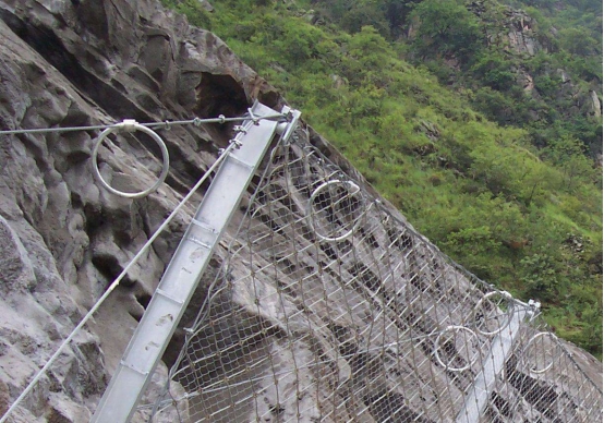 鋪設好后的邊坡防護網不僅可以加固危石,而且可以有效提高邊坡土壤與植被的平衡關系,即使暴雨來襲主動防護網與表面的植被合為一體,有效的保護坡面表層,防止水土流失,當前我國很多山區的高速公路都已安裝主動防護網。在長期惡劣的環境下,即使巖石發生風化也同樣可以被主動防護網安全控制。主動防護網具有很強的拉強度,即使在長期網住即將墜落的巖石,牢固性也不會受到任何的影響。