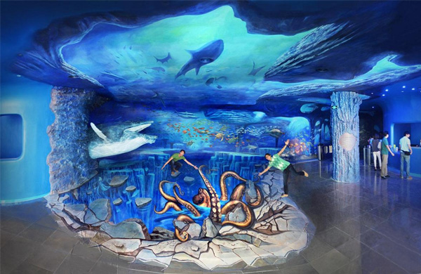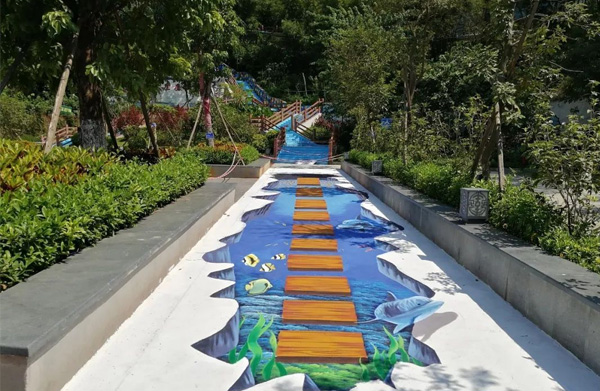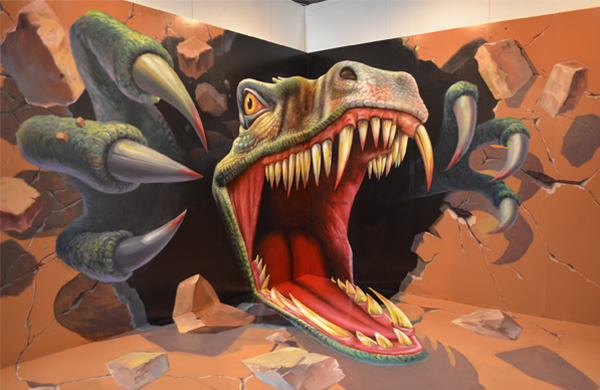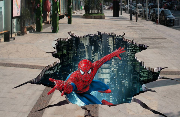 3D街頭涂鴉,則將"藝術效果特殊化"的理念進一步發揚光大,它以室外地面為媒介,利用平面透視的原理,制造出視覺上的虛擬立體效果,令參觀者有一種身臨其境的感覺。3D街頭地畫中的景物立體、細膩、逼真,往往能達到以假亂真的藝術效果。