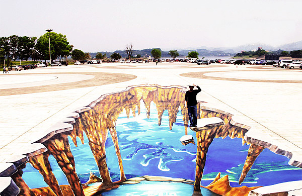 3D街頭地畫可看作這一藝術邏輯在當代的重要發展和延伸。所謂3D街頭地畫,顧名思義就是將畫作展示于地上以求得立體的藝術效果,或直接以地面為載體進行繪畫創作。
