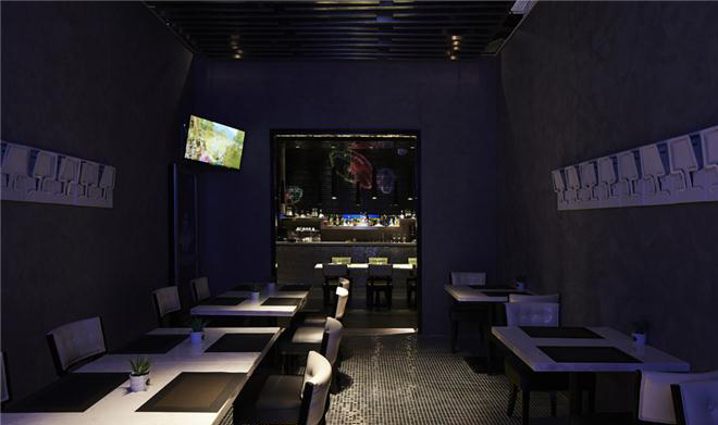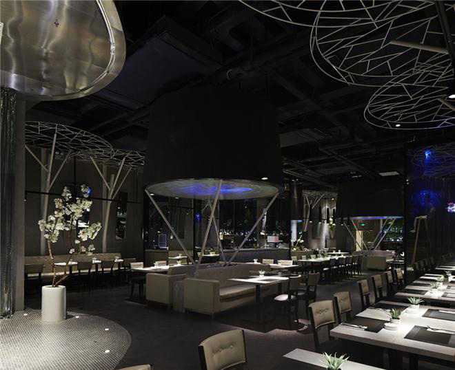 墻面環保的藝術涂料,鋼管噴白制作的樹木雕塑,降低了成本也創造了時尚空間感,70%透度的灰色鏡子和燈光里舞動的水母,低成本卻是很靈動。