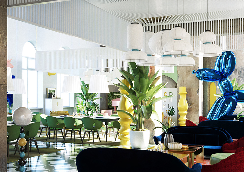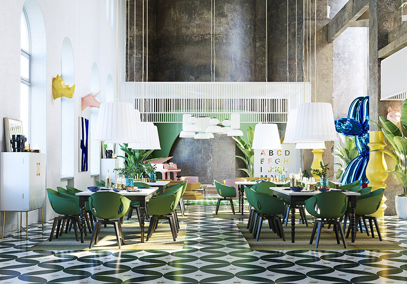 以綠色為主體,穿插不同材質(zhì)不用純度的,紅色,黃色 ,藍(lán)色??臻g里混搭了比較多的元素。