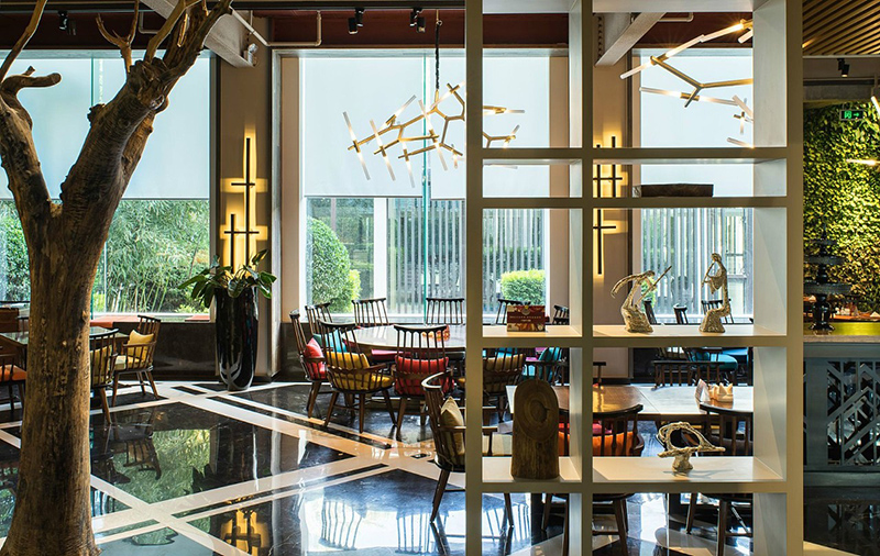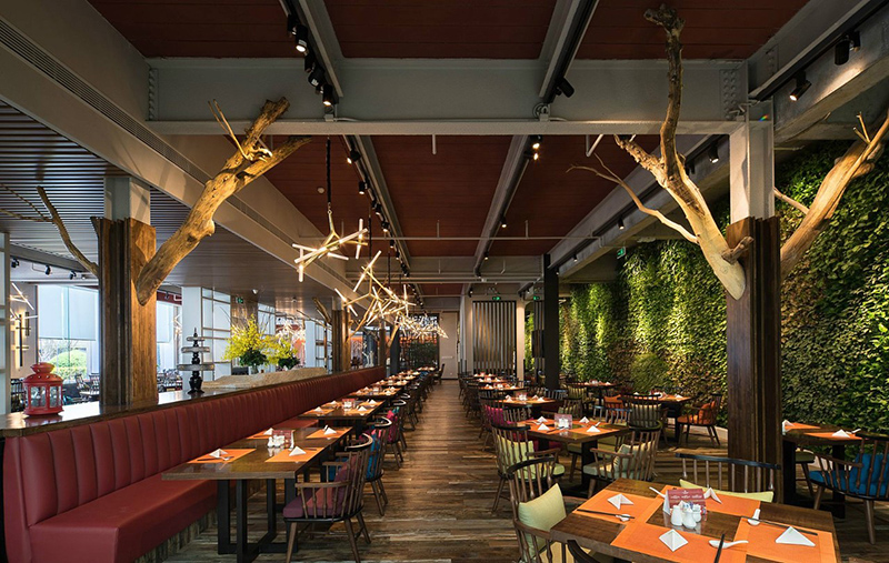 合理的主題設計是整個設計的重點,為空間營造一種氛圍,營造一種趣味,這個“樹”餐廳的設計突顯的是一種原始生活味道,樹的形態加上艷麗的色彩設計,原始、清新的氛圍被細致的描繪了出來,再透過精心的布局,讓身處其中的人感受到寧靜純樸的自然情懷。沒有對材質進行過多的加工,只通過對于原始木質材料的利用就將一種森林味道渲染而出,那天然的色澤加上特殊的肌理組合,是一種原始森林生活的縮影,也正是因為這樣的環境和氛圍,使得整個空間充斥在一種和諧和溫馨感覺之中,能夠讓人拋卻現世的枷鎖和束縛,大大的拉近彼此之間的距離。