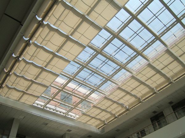 天幕式可伸縮遮陽蓬,其特征在于嵌槽式軌道與道輪相連,通過專用繩索在彈簧的伸縮拉力作用下,產生張拉力直線往復運動,使整個骨架緊湊、完全順滑。結構骨架采用高強鋁合金/鋅合金/ABS樹脂制成。而螺栓和螺絲均由不銹鋼制成。若蓬幅過寬,可能引起整個結構的輕微下垂。最大適用長度6.00米,最大適用伸出長度為6.00米。下面四川窗簾公司電動天棚簾
