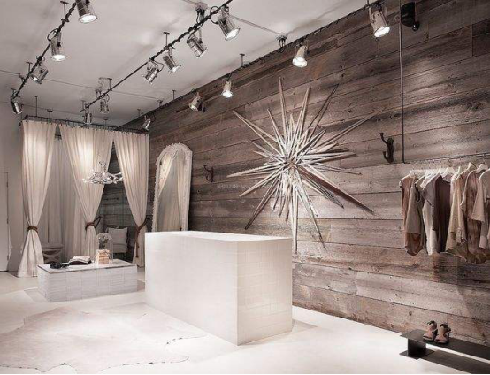 比較文藝一點或者是潮牌的服裝店比較常用,這種形象墻設計會更夸張,或者用一些不那么常用的材料,或者用一些不太顯眼的材料,比如用舊木板、馬賽克、水磨石等,有的還用霓虹燈,這也是為了突出產品的個性,讓消費者記住這個品牌,有一個特別重要的記憶點。