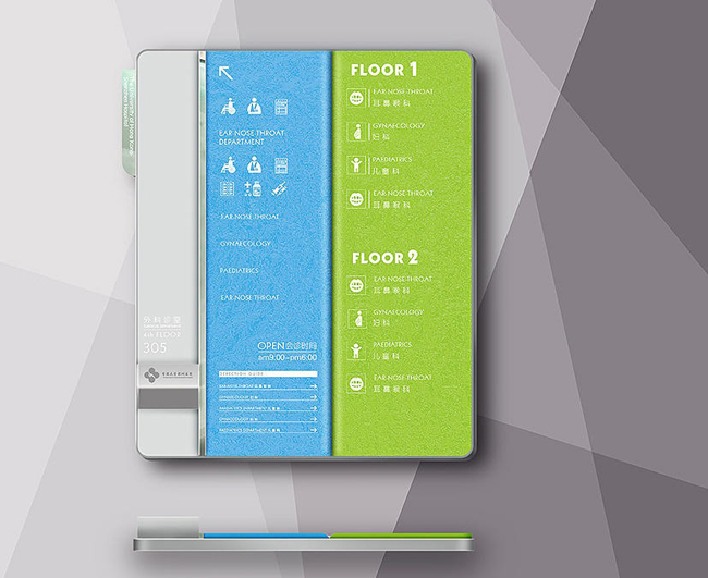 三級標識導向:安裝在各樓層電梯間、電梯內、樓梯口、功能區域口的樓層內容及區域內容,主要使就診者進一步明確所在區域是否正確。