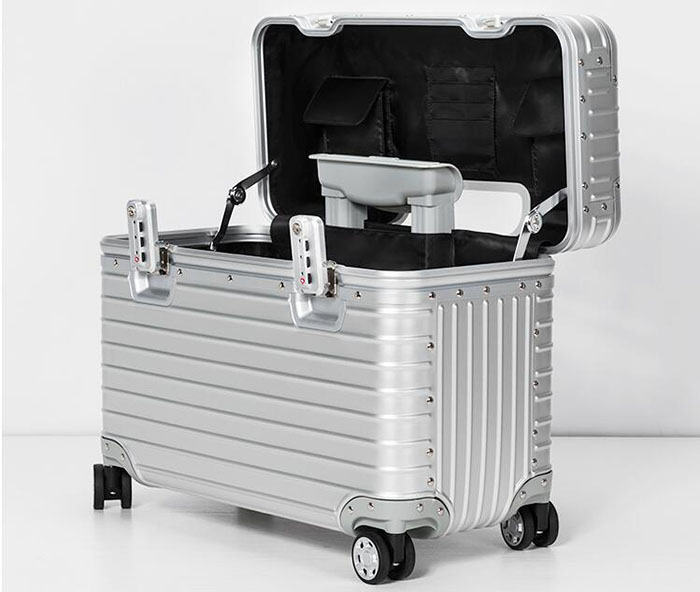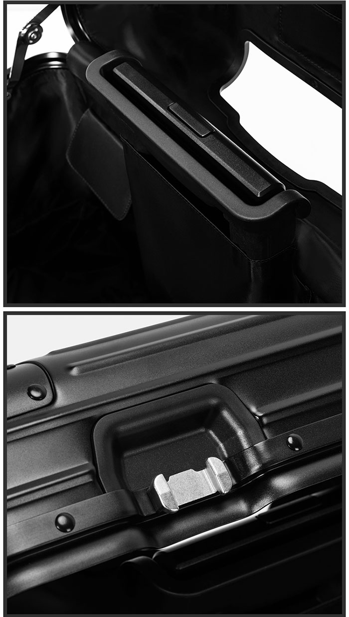 蓋子內的設計可將物品分門門別類;內部空間層次有序;堅固的鋁合金外殼、順暢的滑輪。