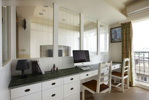落地窗的設(shè)計取代了實體的墻體,保證了室內(nèi)充足的采光,白色的書桌雖略顯簡單,但與凳子、木地板等搭配,看上去簡潔美觀。