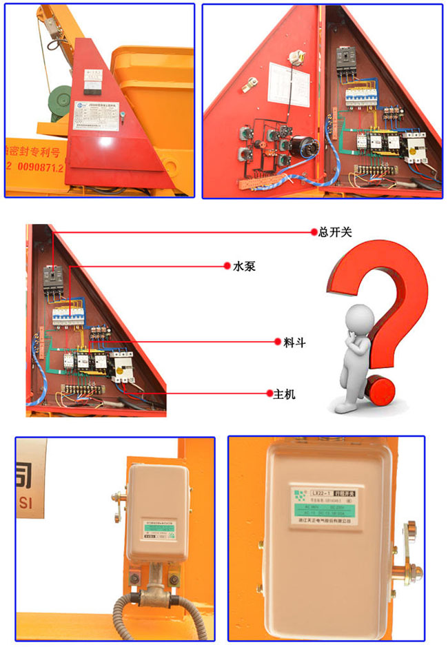 JS500混凝土攪拌機電氣控制線路設(shè)有空氣開關(guān)、熔斷器、熱繼電器,具有短路保護、過載保護的功能。所有控制按鈕及空氣開關(guān)手柄和指示燈均布置在配電箱門上,并設(shè)有門鎖。配電箱內(nèi)的電器元件裝在一塊緣板上,安全可靠,操作維修方便。