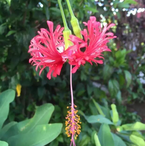 還有一種扶桑是吊燈籠式,也叫吊燈扶桑,花瓣像碎裂的花邊,向上翻起,而花蕊就細長的垂吊,非常細致。