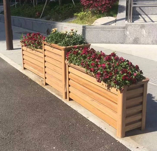 花箱箱體形式多樣,通常采用塑木復合材料、防腐木或其它木質,經加工、制作而成的綠化容器。箱體類型一般有樹池、隔斷花箱和座位式花箱3種,如樹池規格可根據綠化實際需要制作,常用規格有長120cmX寬100cm、長100cmX寬100cm、長80cmX寬80cm等;隔斷花箱常用規格為:長120cmX寬80cmX高60cm,也可根據實際需要靈活制作,座位式花箱規格為長120cmX寬40X高60cm。