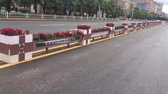 草花應用于道路綠化中,主要指在綠化帶、道路花箱、燈桿綠化、護欄綠化、交通島綠化等處用草本花卉裝點和美化街景,以花箱、花柱、花球、花塔、花墻、綠雕、花境的形式出現,常設在出入口或顯著位置,追求立面觀賞效果,藝術性強;草花使用,又分臨時性造景和常態造景。臨時性造景,主要在重大節日或慶典活動中出現,多數以盆花擺放、花壇造景的方式進行布置,外形為整齊的幾何圖形;常態性造景應用最廣,通常周年進行草花的種植和更換,將花卉脫盆后,以成片或成列種植的方式,在花箱等載體內展現花卉的色彩美和韻律美。