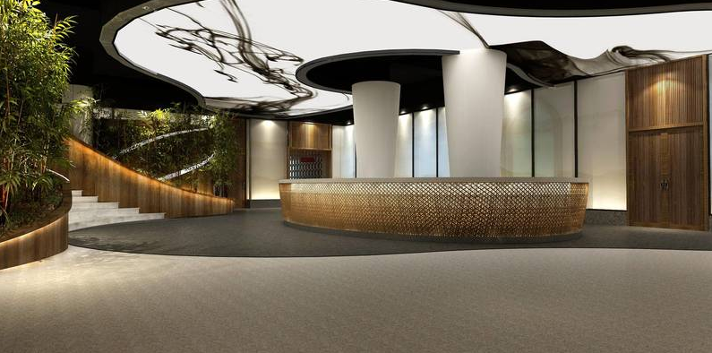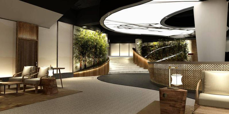 整個空間主體用黑白二色代表陰陽二元,用流墨的游轉,代表上善若水的意蘊,用自然的藤編及木板代表中和之氣,用光代表自然和生命的源起,以形色表達天人合一的初始狀態和意境。