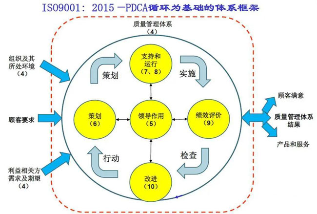 第二次:改版是在2000年。不論是從理念、結構還是內涵,這都是一次重大的變化,標準引入了“以顧客為關注焦點”、“PDCA”、"八項質量管理原則"“過程方法”等基本理念,從系統的角度實現了從質量保證到質量管理的升華,也淡化了原有的制造業的痕跡,具備了更強的適用性;