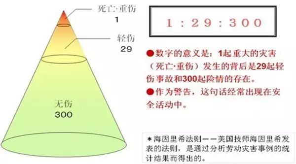 這個法則意思是說,當一個企業有300個隱患或違章,必然要發生29起輕傷或故障,在這29起輕傷事故或故障當中,必然包含有一起重傷、死亡或重大事故。