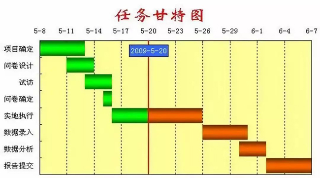這是一種相當靈活的工具。即可以采用4M(人,材料,設備,方法)或6M(加上環境和測量方法)為制造或生產型流程的進行根原因分析,又可用4P(價格,促銷,地點,產品)進行市場和銷售的改善。通過魚骨圖,找到導致問題的原因后,下一步就要準備實施相應的措施,這時候請出我們的第四個法寶——甘特圖,利用它制定出一個行動計劃。