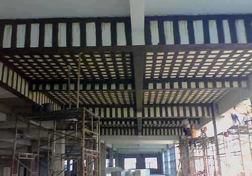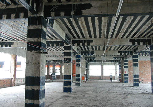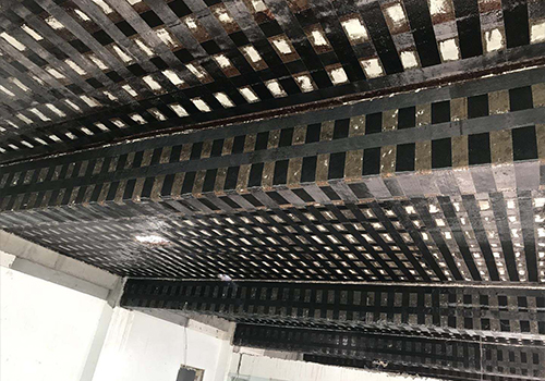 2、材料準備: 按設計尺寸剪裁碳纖維布,且嚴禁折疊;若碳纖維布原有折痕,應裁去有折痕一段。按要求對碳纖維膠粘劑進行配比,用電動攪拌器均勻攪拌。 3、粘貼碳纖維布:將配制好的碳纖維膠粘劑均勻涂抹于粘貼部位的混凝土表面,將裁剪好的碳纖維布按照放線位置敷在涂好的碳纖維膠粘劑的混凝土表面,碳纖維布應充分展平,不得有褶皺,用特制滾筒沿碳纖維布方向多次滾壓,使膠液充分浸漬碳纖維布。(粘貼多層碳纖維布時,請在碳纖維布表面的膠液達到指干狀態時立即粘貼下一層;若延誤時間超過1h,請等12h后方可重復上述步驟進行粘貼,但粘貼前應重新將碳纖維布粘合面上的灰擦拭干凈)最后一層碳纖維布粘貼完畢,應在其表面均勻涂刷一道碳纖維膠黏劑。若碳纖維布需要搭接,其受力方向每端搭接布不應小于200mm。? |