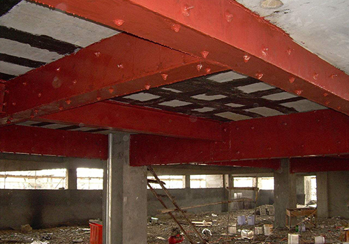 三、框架梁的加固方法 在支撐梁的兩端柱上加鋼筋混凝土柱帽,在搗混凝土柱帽時在柱帽里預埋鋼板,等柱帽的混凝土養護期到了規范的時間了,將滿足要求的工字鋼直接與柱帽上鋼板焊接成為一個整體,工字鋼上邊直接抵梁的下口。 四、碳纖維布加固法 在需要加固的地方,粘貼悍馬碳纖維布進行加固,現在是用的最多的加固方法。? |