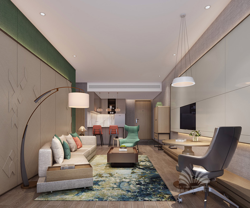 客廳以大白墻為背景、時尚的掛畫給客廳增添了一股現(xiàn)代感的氣息,木條拼接為主基調(diào)的設(shè)計(jì),通透的落地窗使得室內(nèi)光線十分充足。酒店設(shè)計(jì)中皮質(zhì)的沙發(fā)質(zhì)感細(xì)膩、室外的景觀跟室內(nèi)的軟包恰到好處的融合到了一起,使得整個空間氛圍溫馨靜謐,舒適自然。廚房的設(shè)計(jì)選用一些比較老舊的材料設(shè)計(jì),使得酒店設(shè)計(jì)整個空間具有一種獨(dú)特的工業(yè)美感,把廚房很好地從整體空間區(qū)分出來,分區(qū)明確。