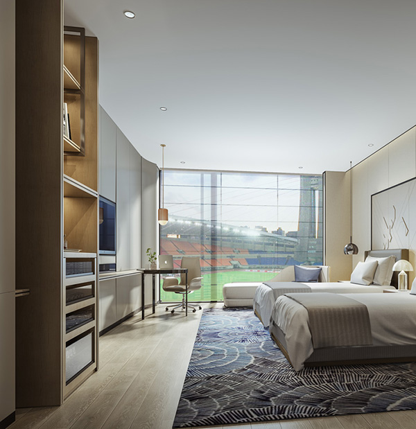 酒店的地板和招待臺有著非常具有個性化的設計,既把分區進行了明確的分割,也給空間增添了時尚的裝飾氣息。酒店的房間還開辟了戶外空間,為房客們提供了一個社交、放松的場所,不再是簡單的單調。影音娛樂室、健身房、小咖啡館等設施應有盡有,加上空間充滿大膽的幾何圖形,將每一塊分區都做得非常明顯、極具個性,適合年輕人的時尚品味。