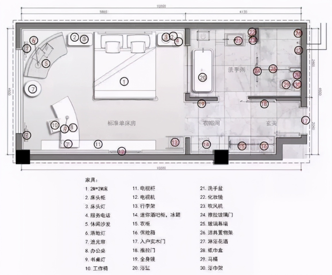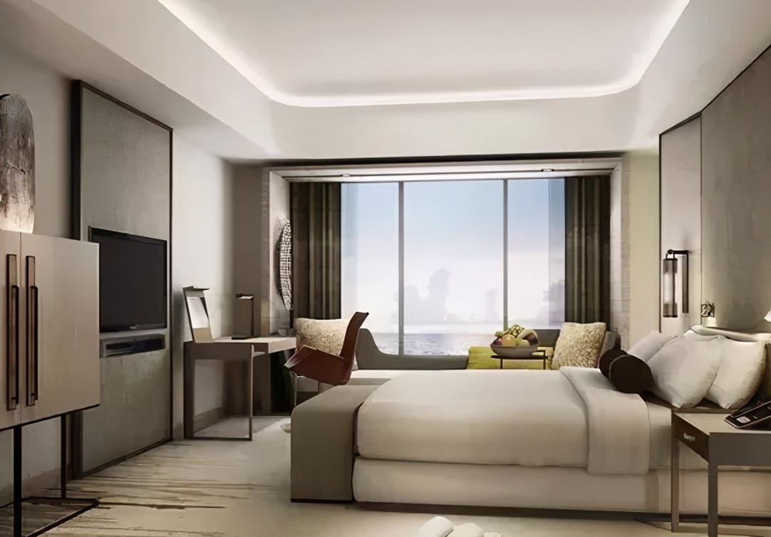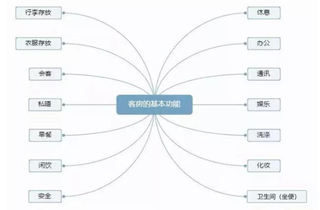我們所熟知的酒店客房的基本功能如下:休息,辦公,通訊,娛樂,洗滌,化妝,衛(wèi)生間(坐便),行李存放,衣物存放,會客,私晤,早餐,閑飲,安全等。由于酒店的性質(zhì)不同客房的基本功能會有增減,為基本功能進行的設(shè)計主要體現(xiàn)在建筑平面,家具平面,天花平面,水電應用平面。