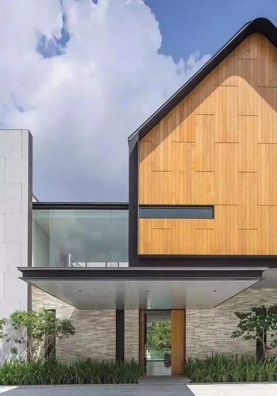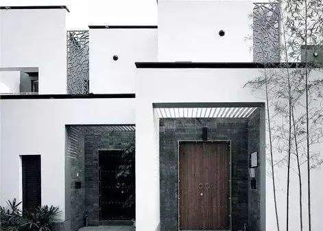 大面積白色墻體+黑色門框+木門。通過色彩與尺度上的對比更能彰顯入口的場所特征。