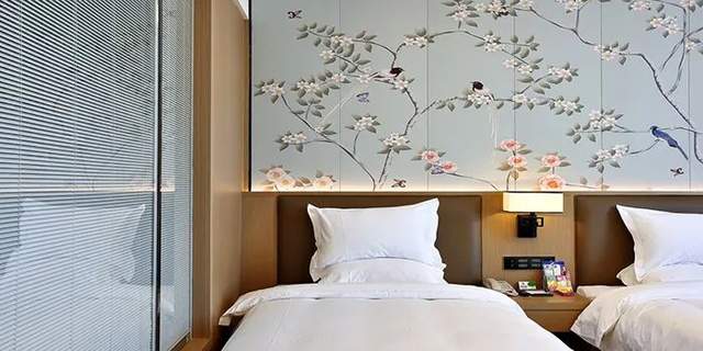 第三,進行商務酒店設計的時候,商務酒店客房地毯盡可能不要純淺色的,要采用防污且要防火的材料,床頭柜等家具要用圓角的,避免給客人造成傷害,床頭燈最好使用旋轉按鈕控制燈光亮度,營造舒適的就寢光環境。另外,客房內可以擺放一些藝術品或掛畫,從側面體現酒店管理者的品位。