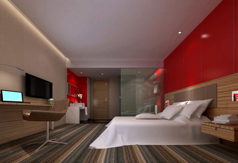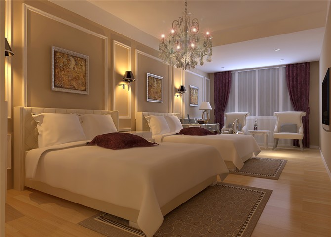 墻面、吊頂宜簡潔大方。界面(墻面、吊頂、地面)處理要平淡,體現(xiàn)樸素、舒適的氛圍。在顏色的選擇上,尤要注意調(diào)和、含蓄,顏色種類不能過多過雜,至多吊頂及墻面選用兩種色澤搭配,比如白乳膠漆吊頂配以淺米黃、暖灰等彩色墻面,再以一條掛鏡線區(qū)分開來,酒店客房照明宜平淡中見溫情。照明設(shè)計(jì)及燈具的選擇要注意造型的樸實(shí)及發(fā)光方式的確定,要在平淡中見溫情.客房裝修首先要注意客房的私密性。客房的隱秘性主要體現(xiàn)在客房的不可見和不可聽。這就要求它要具有較為嚴(yán)密的保護(hù)措施,這包括了門扇的嚴(yán)密度和窗簾的嚴(yán)密度。