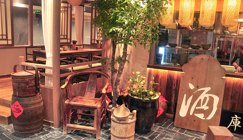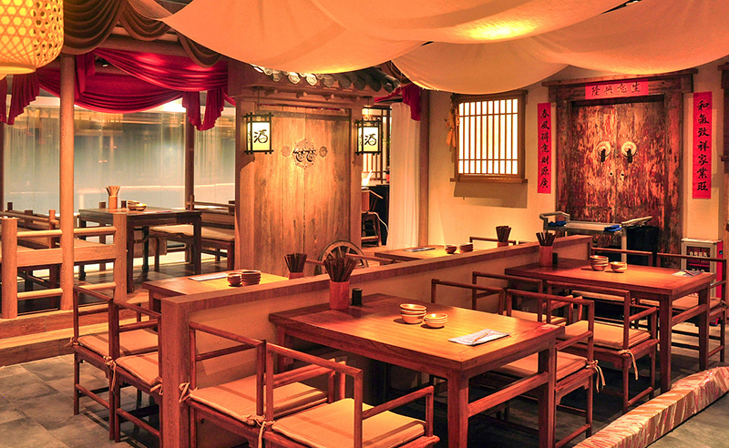 仿佛將客人領入古代的酒樓,去享受那個時代的繁盛奢華的生活。實木門面仿古做的惟妙惟肖,讓人耳目一新,很有特色。再加上實木雕刻的店門,可見其做工細膩,獨具匠心。如此的設計會成為那些有懷舊情節或是追求高雅恬淡生活的客人首選,因為它古樸自然的風格實在是引人注目。
