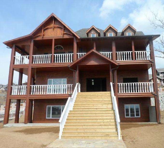 保溫效果:木屋的墻體就像保溫瓶膽,而普通磚混或水泥墻體就像玻璃杯。木材的多孔性構造使木材自身隔音的性能優于其他材料,而且木屋的墻體是由保溫隔音防潮材料構成的多層材料復合墻,木屋屋頂和地面均有保溫隔熱材料組成加之高質量的邊縫處理技術,使得木結構具有很好的保溫隔音性能。能源消耗少,大大地為消費者節省能源費用。研究表明, 150mm厚的木結構墻體,其保溫性能相當于 610mm厚的磚墻,木結構相比磚混結構節能 50-70% 。
