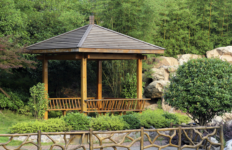 其次, 結構設計上: 1. 炭化木涼亭頂蓋采用三層防水處理,最上層的頂層板采用直板疊壓做法或是仿琉璃瓦片的做法。中間鍍鋅鋼板起到防雨功能,底層采用薄插接板防止因熱脹冷縮引起內頂開裂,頂蓋再安裝上封雨的脊瓦和寶頂,該結構防雨防潮效果俱佳,又不易變形。工藝復雜,要求精細度極高。