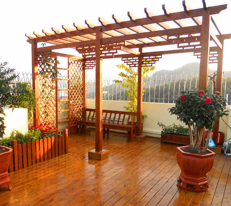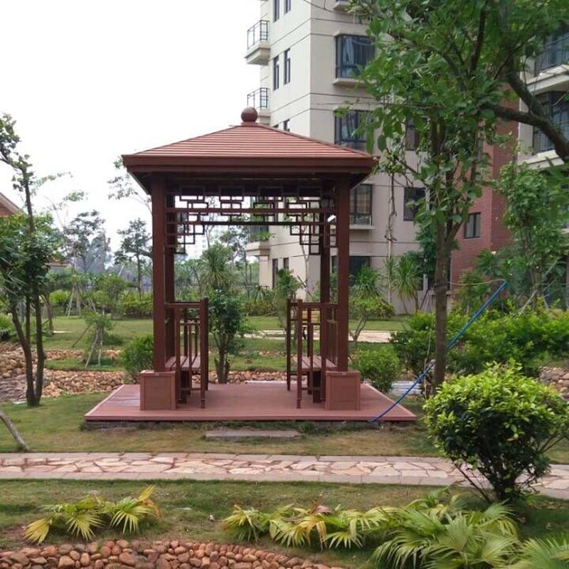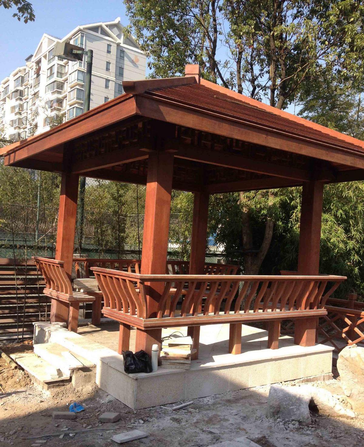 防腐木涼亭,是指用防腐木組建而成的涼亭。所使用的防腐木是經過特殊防腐工藝處理后的木材,具有防腐爛、防白蟻、防真菌的功效。故此類涼亭穩定性強、使用期限長、性價比高。防腐木專門用于戶外環境的露天木地板,并且可以直接用于與水體、土壤接觸的環境中,是戶外木地板、園林景觀地板、戶外木平臺、露臺地板、戶外木棧道及其他室外防腐木涼亭的首選材料。