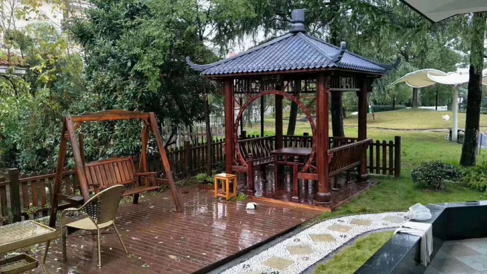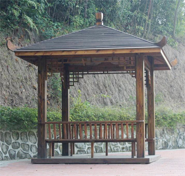 三、看涼亭的頂部。優質的涼亭頂部是有三層設計,內層為一層碳化木,中間層為防水板,外層是碳化木瓦片,一般采用的是琉璃瓦,瓦片溝槽具有排水功能,三層設計不易漏水,可以放心置于室外。亭子內燈的線路都是出廠前布好的,亭子葫蘆頂四根米字形橫梁里面有開槽,葫蘆頂里面自帶有電線。