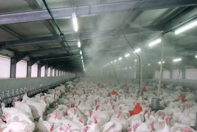 2、調節溫度。由于噴霧加濕機運行時噴灑出的霧化顆粒非常細小,只有5-15微米,很容易吸收周圍空氣中大量的熱量從而被蒸發,達到降低溫度的目的,因而可以實現一定空間內的溫度調節,從這一點上來說也是符合養雞的標準的。