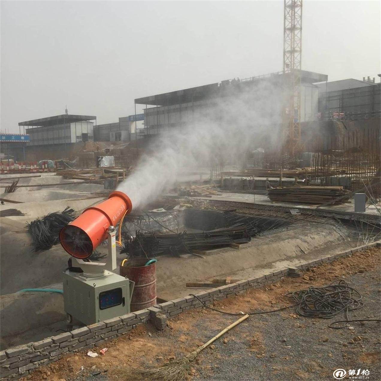 霧炮是根據風送原理,先使用進口高壓泵、微細霧化噴嘴將水霧化,再利用風機風量和風壓將霧化后的水霧送到較遠距離,使得水霧到達較遠距離同時能夠覆蓋更大面積,水霧與粉塵凝結后降落,從而達到降塵目的。