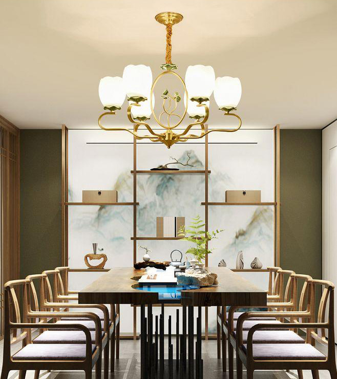 在餐廳區(qū)域,長(zhǎng)方形的餐桌安裝吊燈或長(zhǎng)的橢圓形吊燈。餐廳的天花板和四壁都要有充足的光線,可采用射燈或者壁燈輔助照明。
