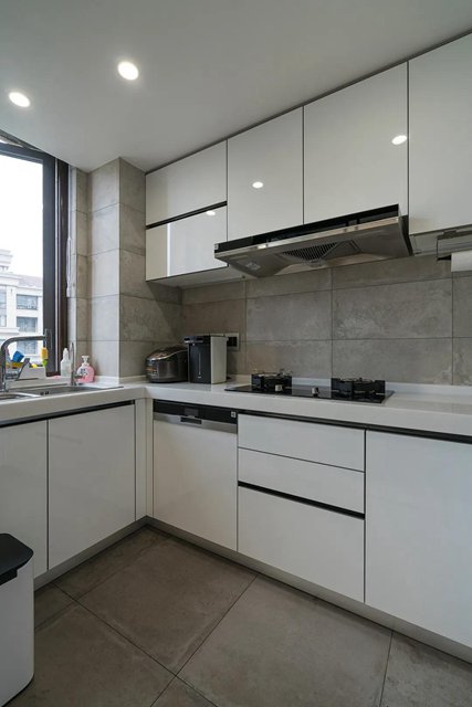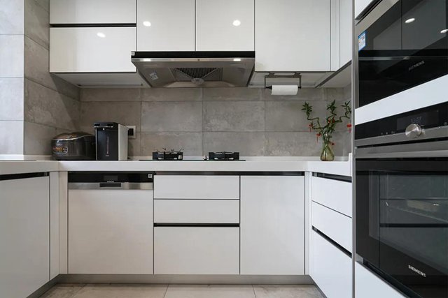 面積不大,考慮到業主對烹飪的熱愛,設計師把陽臺擴充進來做成U字形廚房,這樣一來廚房的操作臺面多出了很多,一面是定制柜,冰箱烤箱蒸箱全部嵌入式。