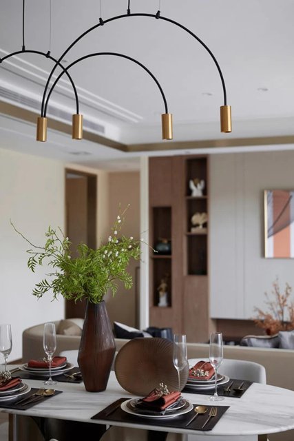 餐廳點綴不同層次的色調。藝術感的吊燈延續客廳浪漫氣氛,弧形的大理石餐桌搭配綠植為餐廳增加一份簡潔清爽。