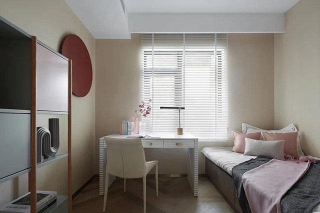 白色書桌色彩隱藏法放大空間,隨手觸及的開放格,空間不同材質和顏色的碰撞。孩子在這里寫作業看書都方便,靠窗設計,采光十足,非常貼心的設計。