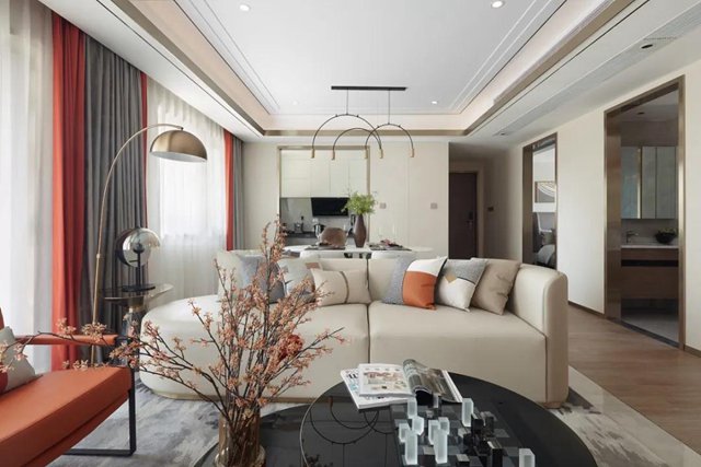 客廳米色的皮質沙發,和側面的橙色椅,金屬元素的落地燈,擺上雅致精致的小物件,呈現出自然舒適的溫馨感。