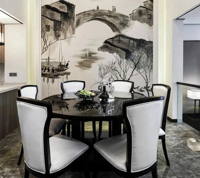 江南山水為景,方圓之態為構,賦予空間傳統溫婉的氣質。墨色與白色相結合,將中式留白之美,盡現于此。
