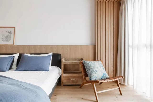 原木作為背景墻裝飾,溫潤質樸,不僅讓人身心放松,同時如同置身于大自然的懷抱之中一般,寧靜又安逸,不經意間營造出恬靜柔和的畫面。