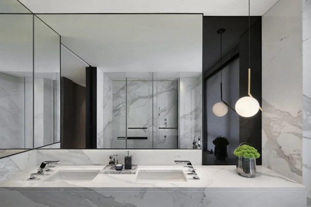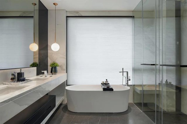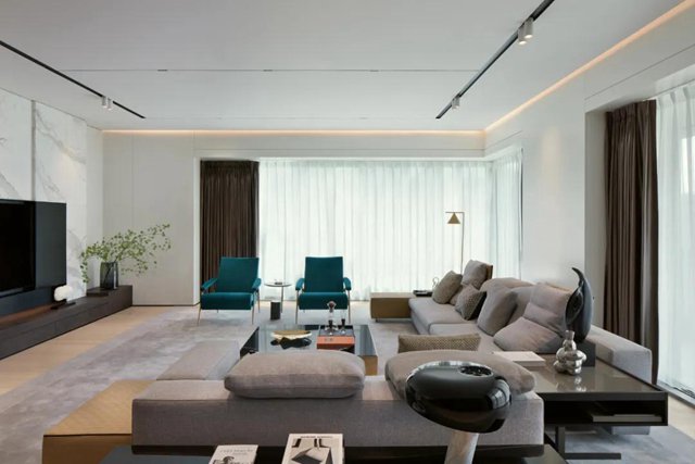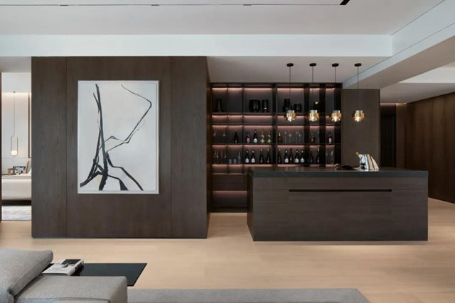 為合理利用空間,布局上增加了水吧區、閱讀區,滿足居住者的不同需求。設計處處關照居住的細節,智能燈光系統根據居住場景呈現會客、休閑、起夜等模式,燈光隨心而動,電動窗簾靜音又省力。