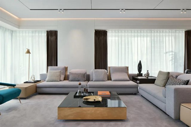 高雅的生活環境,精致的生活品質,令身處國際都市的現代人所追求。客廳保證大面積采光面,開敞通透。地毯由真絲羊毛混織而成,順滑蓬松,形成美麗的光澤感。金色茶幾、皮質茶幾、玻璃器皿、金屬托盤之間形成豐富材質的碰撞,烘托出豪宅的品質感。