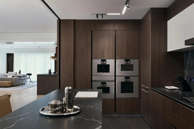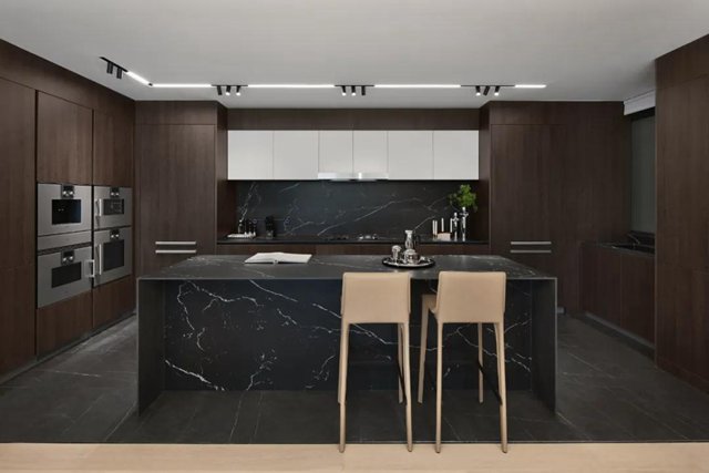 闊綽的中西雙廚區,選用德國高端進口Hacker櫥柜,筒燈為廚房營造藝術品般的照明氛圍。