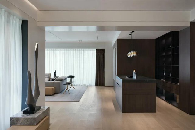 室內設計在原平面布局的基礎上,打破隔斷,打造出一個舒適與功能兼具的空間。平實溫厚的深色木和白色的墻面成為空間的主要基調,軟裝提取山色余暉概念,與各種極具藝術氣質的家具相互結合,營造出柔和不做作的空間氛圍。
