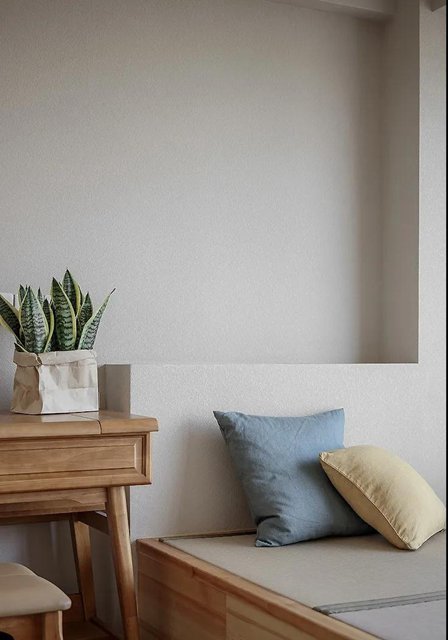 全實木的榻榻米也可儲物,搭配素樸的抱枕以及清新綠植,營造舒適愜意的空間氛圍。