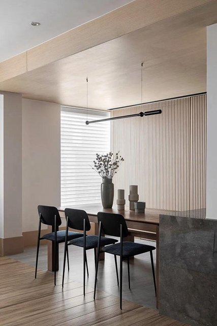 客廳選擇了地板,與空間的木白呼應,整體設計盡可能滿足了女主對木元素的喜愛。在餐廳處,選擇了與島臺相似的地板顏色來劃分空間,地磚和地板直接拼接,搭配出更佳的視覺效果。