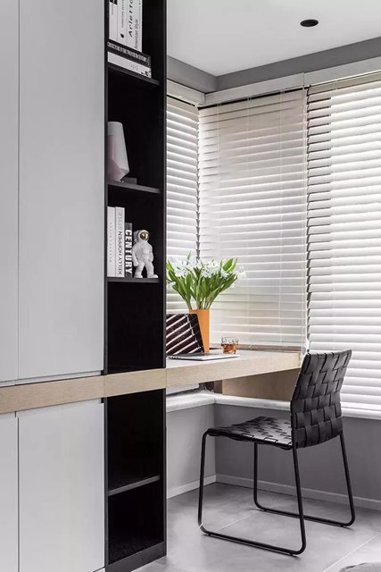 在電視墻的角落位置,延伸出了書柜+書桌的區(qū)域,輕松打造了一個舒適的小書房。